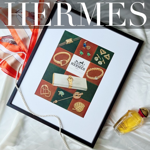 HERMES 1952 アートポスター 1952年エルメスのレトロなヴィンテージアートポスター! チェック柄の革をバックにエルメスのポップでかわいいアクセサリーが乗せられたデザインは、美しいカラーリングと共に存在感を放ちます。 入手困難なポスターであり、その美しさとエルメスのロゴが伝統と歴史を感じさせる一枚。 フレーム付きですのですぐにお部屋やオフィスを華やかに飾っていただけますし、一気にモダンな高級感が漂い、空間をおしゃれに魅了します。 エルメスのラグジュアリーなアートポスターは、壁掛けインテリアとして空間を格上げするだけでなく、特別な存在感を与えます。 この貴重な一枚を手に入れた日から、毎日の生活にエレガントな気分が広がること間違いなしです! ぜひ、お部屋に飾ってみてくださいね。 また、その希少性からコレクターズアイテムとしても人気です。 ※複製品・リプリントしたものではございません。 ※1952年の広告で大変貴重です。 是非、今だけのチャンスをお見逃しなく。 サイズと品質 ・額縁は四つ切サイズ(内寸424mm×348mm)、フレームの幅は13mmです。 ・額縁は新品です ・マット、飾り紐付き 一点ものの美 ヴィンテージアートポスターは【世界にただ一つしか存在しない特別な一点もの】です。 たとえ同じデザインであっても、大きさや印刷方法、状態など異なるヴィンテージものです。 <ご注意> ・お使いのディスプレイによって、実際のポスターとイメージや色味の違いが異なることがございますのでご了承ください。 ・ポスターは数十年前のものを加工しているため、温湿度、日光、カビなどの環境条件で変色、褐色、シミ、亀裂、波うちなどが生じることがありますのでご注意ください。 ・この商品はヴィンテージアートの“味”を楽しむためのものです。 商品の特性上、経年による変色や傷は、このアートポスターの個性の一部としてお楽しみいただければ幸いです。 ・梱包は透明の袋にいれた後、化粧箱に入れ、緩衝材等で梱包予定です。 ・発送はお支払い後、3日以内に発送予定です。(アトリエからの運搬のため) ※土日は含めません