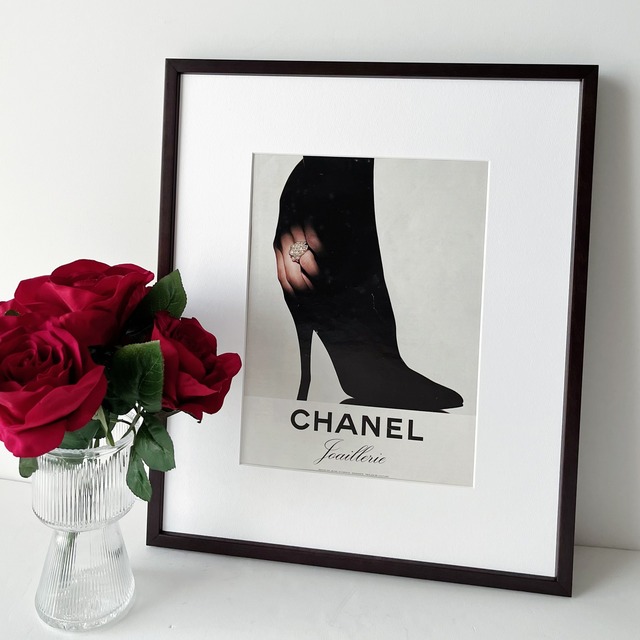 CHANEL 1996 アートポスター シャネルのレトロなヴィンテージアートポスター! 存在感のあるヒールのシルエットが美しく、足首にはシャネルの指輪をした手が見えるのがユニークでセクシーなポイント。 シャネルのロゴも入っていて、シンプルながらもかわいいデザインがお部屋をおしゃれに演出します。 フレームも付いているので壁掛けアートとして、すぐにお部屋を華やかに飾っていただけますよ。 モダンでポップなインテリアにピッタリです。 お部屋のアクセントとして、この素敵なポスターをご堪能ください。 また、その希少性からコレクターズアイテムとしても人気です。 ※複製品・リプリントしたものではございません。 ※1996年のもので大変貴重です。 是非、今だけのチャンスをお見逃しなく。 サイズと品質 ・額縁は四つ切サイズ(内寸424mm×348mm)、フレームの幅は13mmです。 ・額縁は新品です。 ・マット、飾り紐付き 一点ものの美 ヴィンテージアートポスターは【世界にただ一つしか存在しない特別な一点もの】です。 たとえ同じデザインであっても、大きさや印刷方法、状態など異なるヴィンテージものです。 <ご注意> ・お使いのディスプレイによって、実際のポスターとイメージや色味の違いが異なることがございますのでご了承ください。 ・ポスターは数十年前のものを額装しているため、温湿度、日光、カビなどの環境条件で変色、褐色、シミ、亀裂、波うちなどが生じることがありますのでご注意ください。 ・この商品はヴィンテージアートの“味”を楽しむためのものです。 商品の特性上、経年による変色や傷は、このアートポスターの個性の一部としてお楽しみいただければ幸いです。 ・梱包は透明の袋にいれた後、化粧箱に入れ、緩衝材等で梱包予定です。 ・発送はお支払い後、3日後に発送予定です。(アトリエからの運搬のため) ※土日は含めません