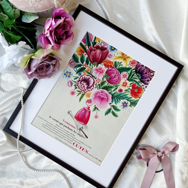 <1966 広告>CUTEX ポスター ヴィンテージ アートポスター フレーム付き 額縁 インテリア モダン おしゃれ かわいい 壁掛け ポップ レトロ 花