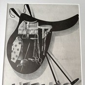 モノクロの余白に大胆に配された馬具のシルエットは、まるで時代そのものを切り取ったような存在感を放ちます。
