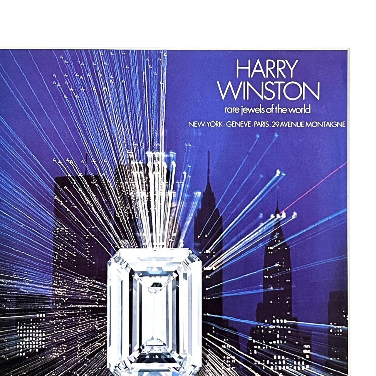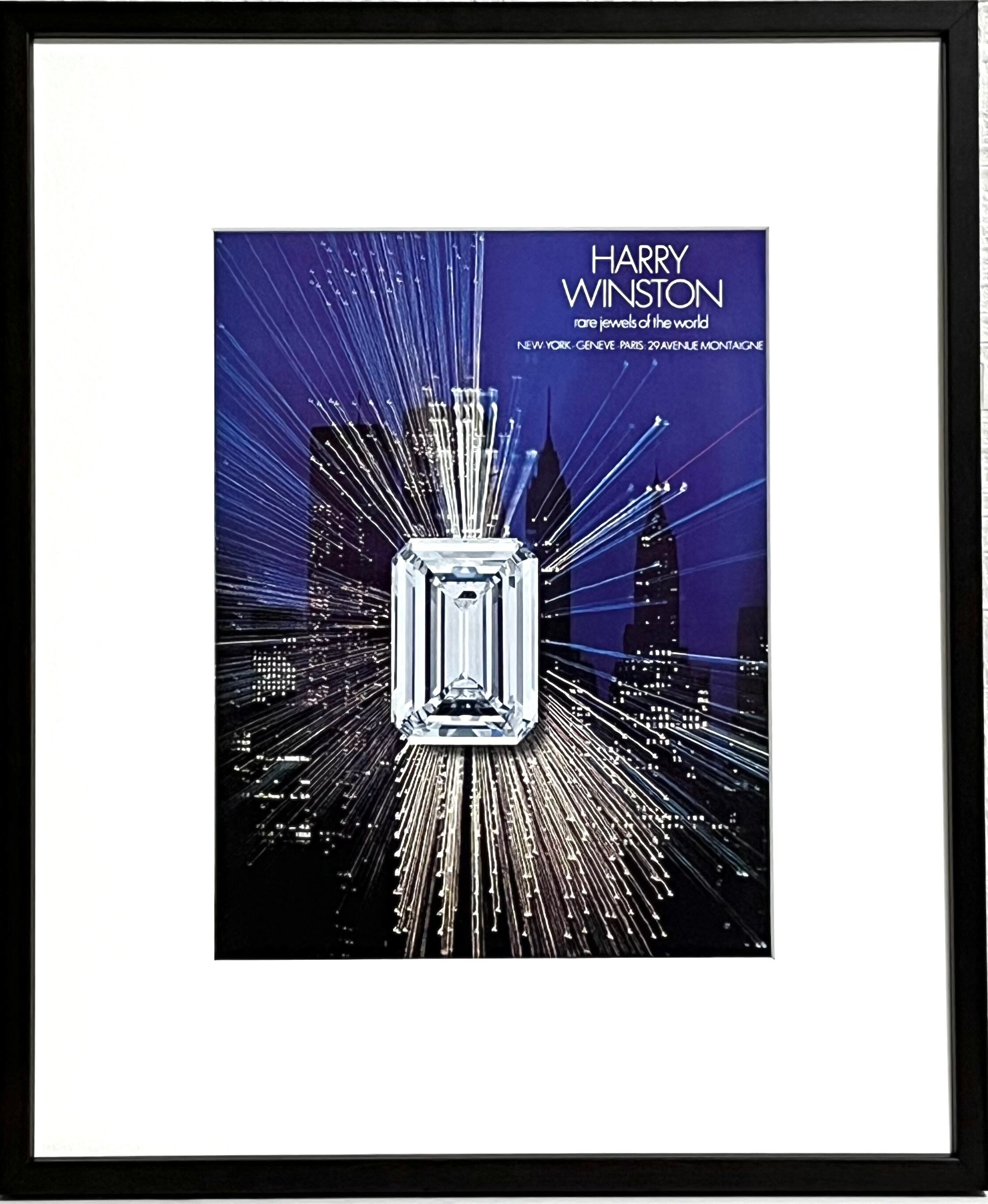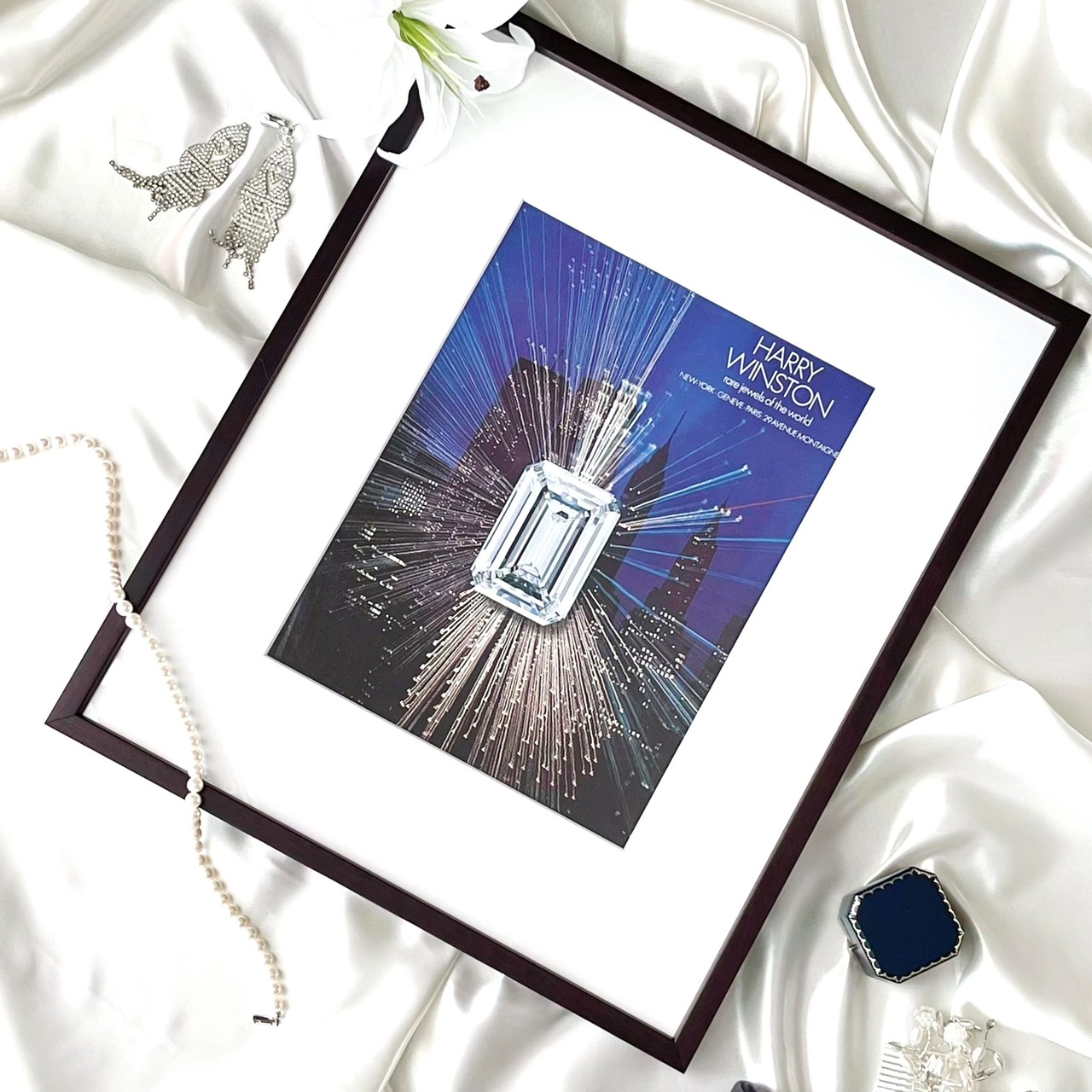 夜の都会の光とダイヤモンドの輝きが美しい、ハリーウィンストンのレトロなヴインテージアートポスター。