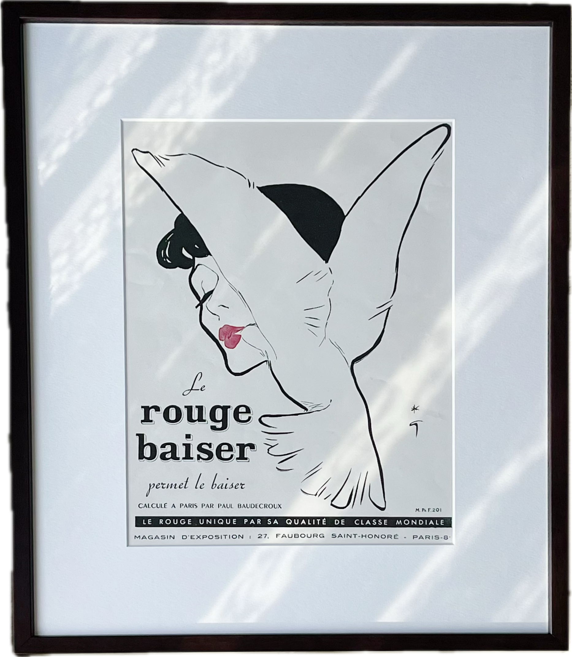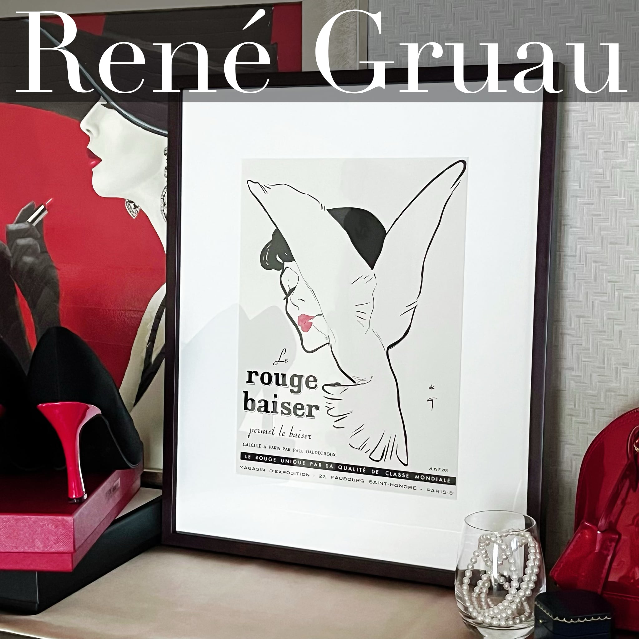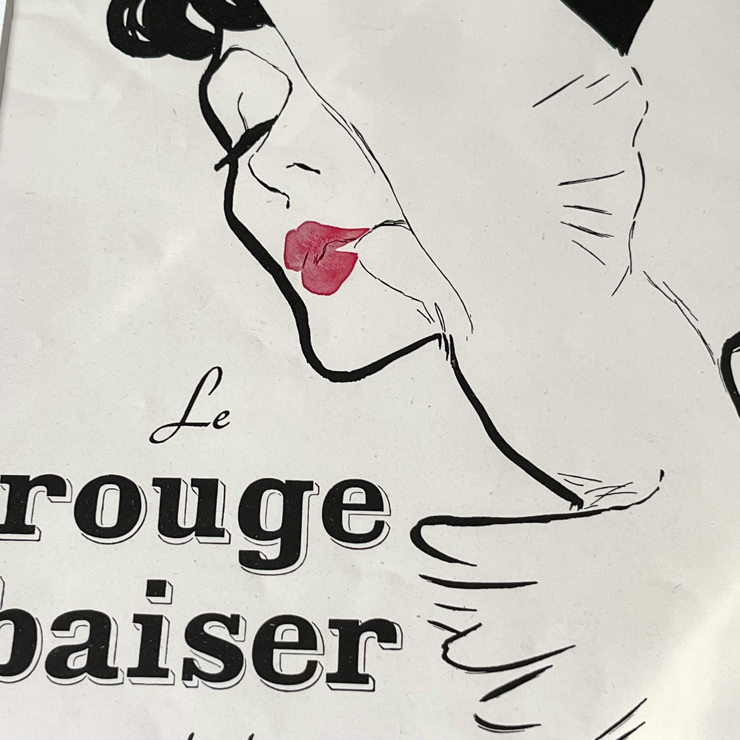1940~1950年代にパリのファッション雑誌で活躍したイラストレーター、Gruau(グリュオ)により描かれた、"Rouge Baiser"のレトロなヴィンテージアートポスター。