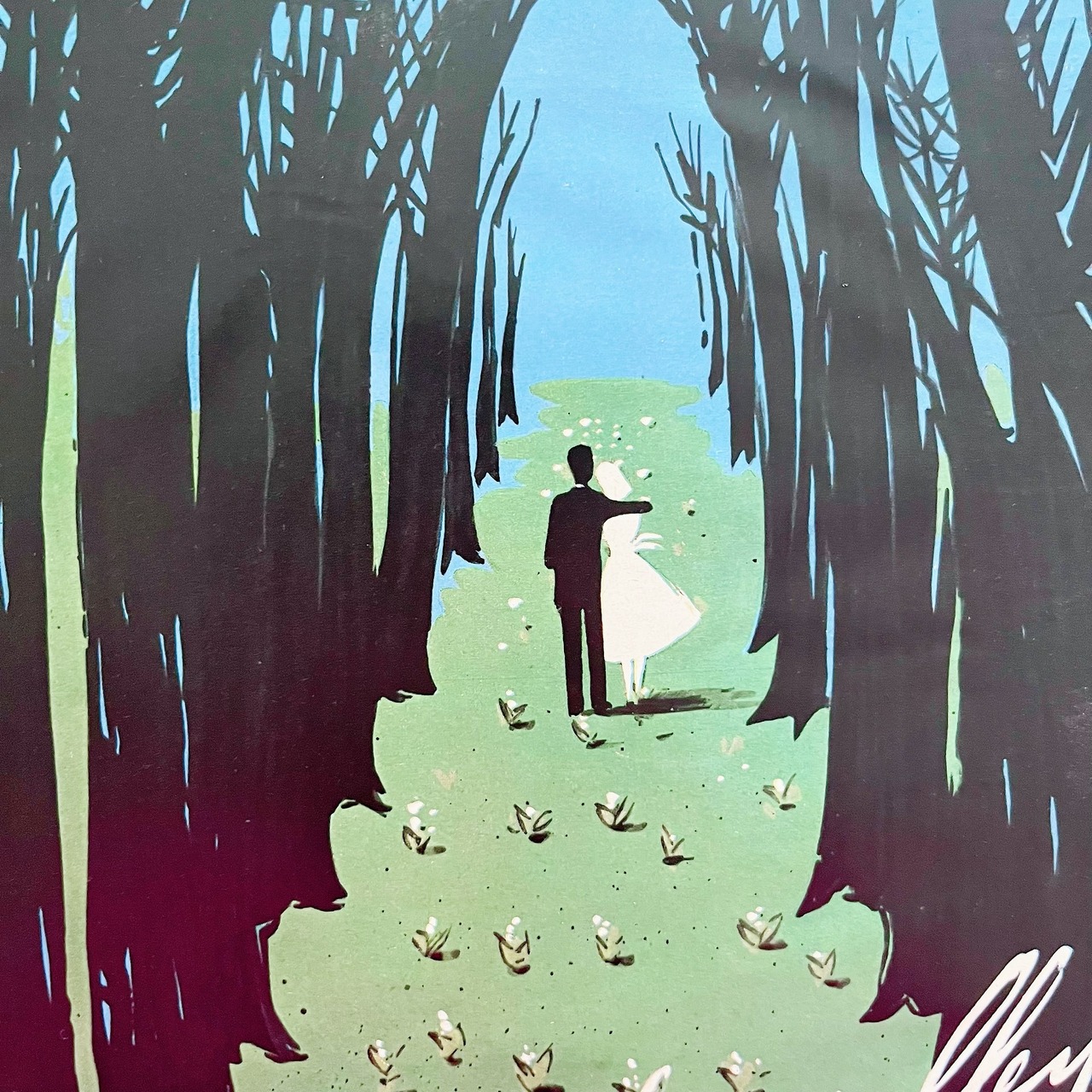 かわいいすずらんの花々が咲く清々しい森の道を幸せそうに歩くカップルが描かれた、まるでおとぎ話のようなデザインが特徴です。