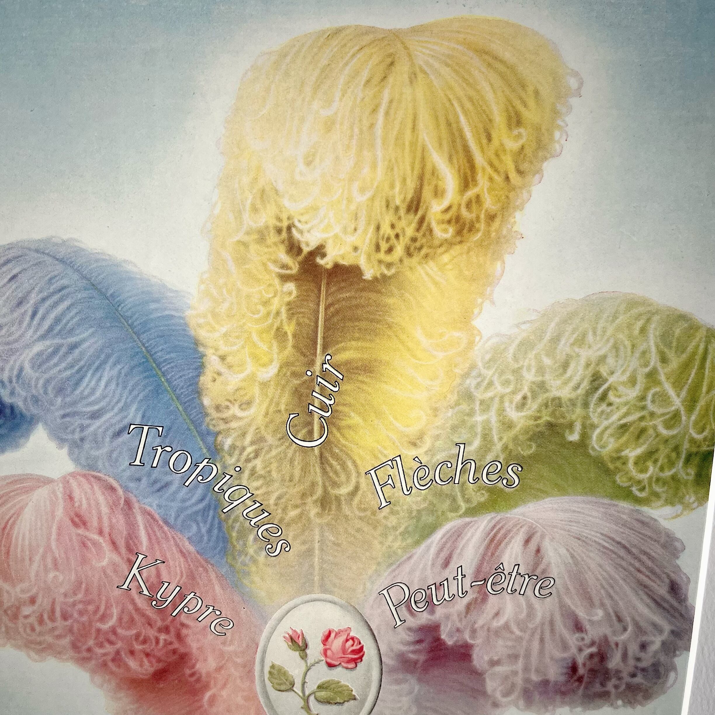 それぞれの羽には香水の名前が書かれ、パリのユニークな粋さも感じられる一枚。