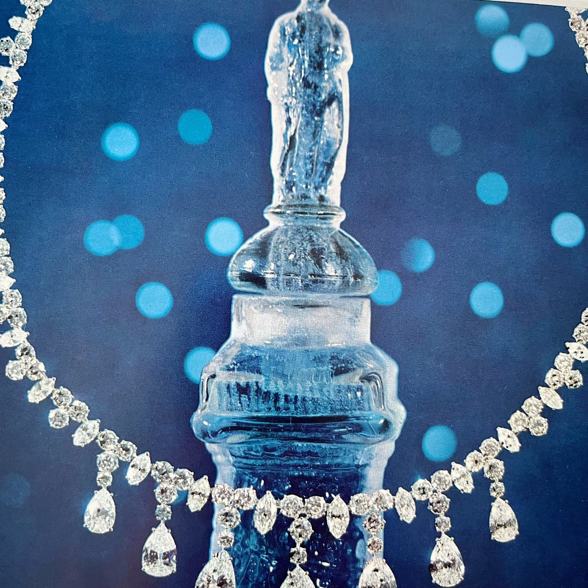 ブランドの象徴ともいえるヴァンドーム広場の夜の塔をバックに、美しいダイヤのネックレスが贅沢な一枚。