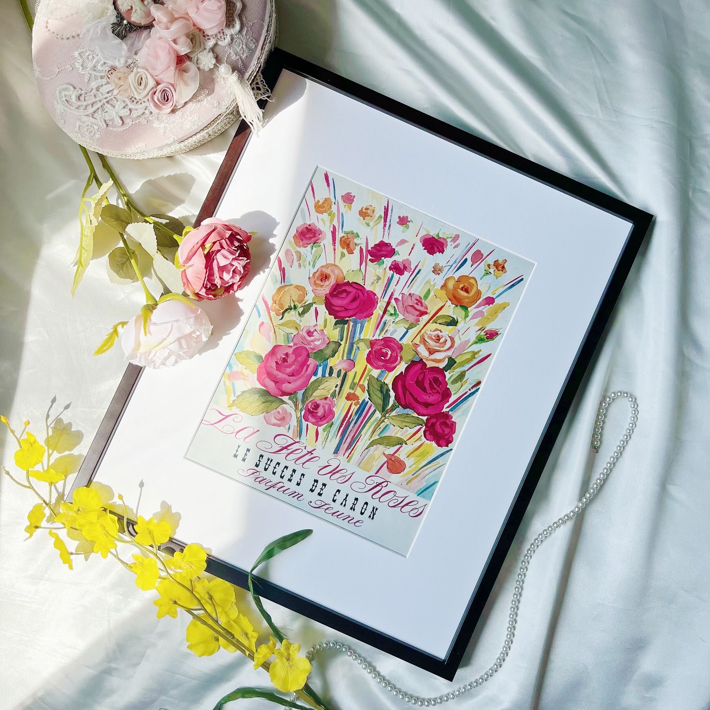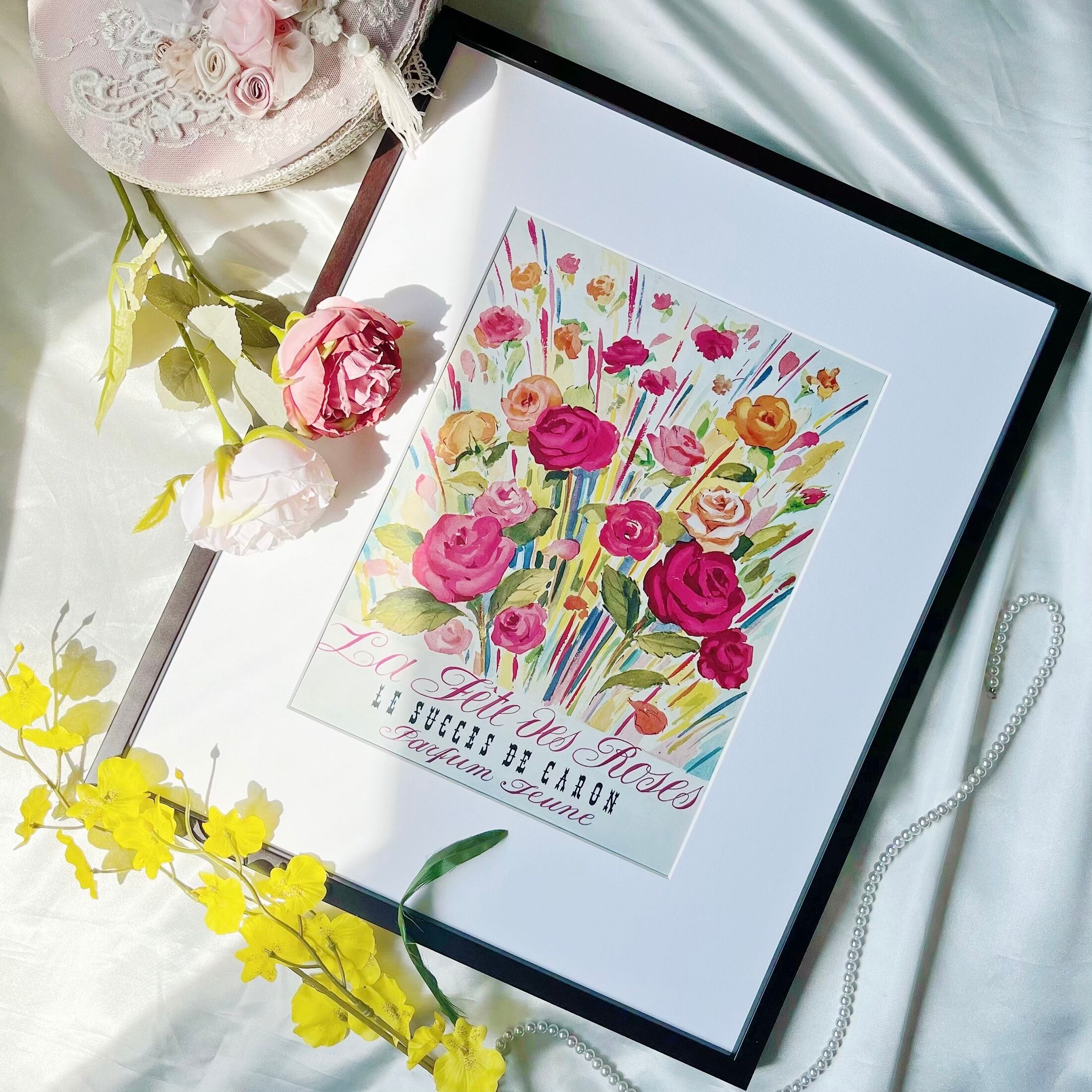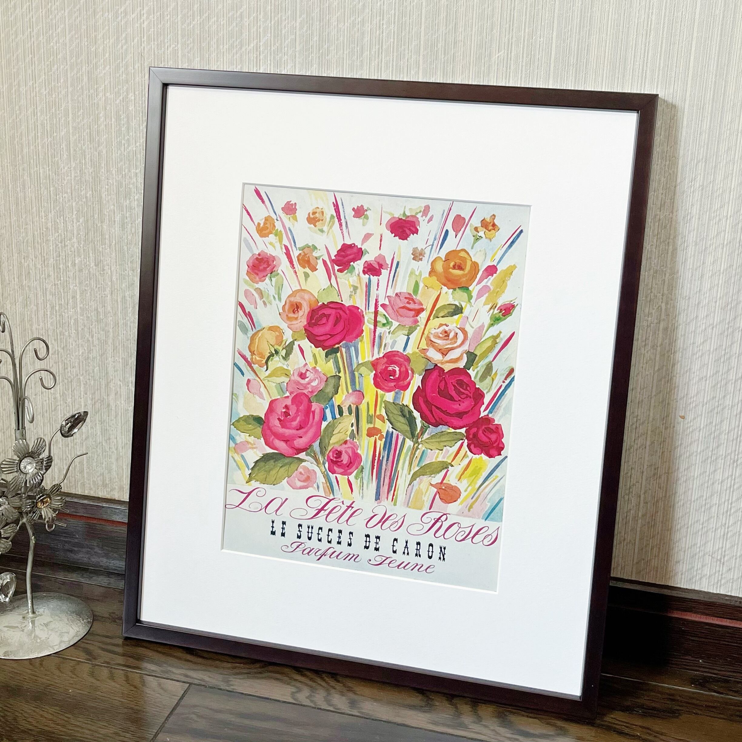 <母の日に!1952 広告>CARON ポスター ヴィンテージ ビンテージ アートポスター 額付 フレーム付き インテリア モダン おしゃれ かわいい 壁掛け フランス ポップ ピンク リボン 英語 レトロ 花