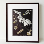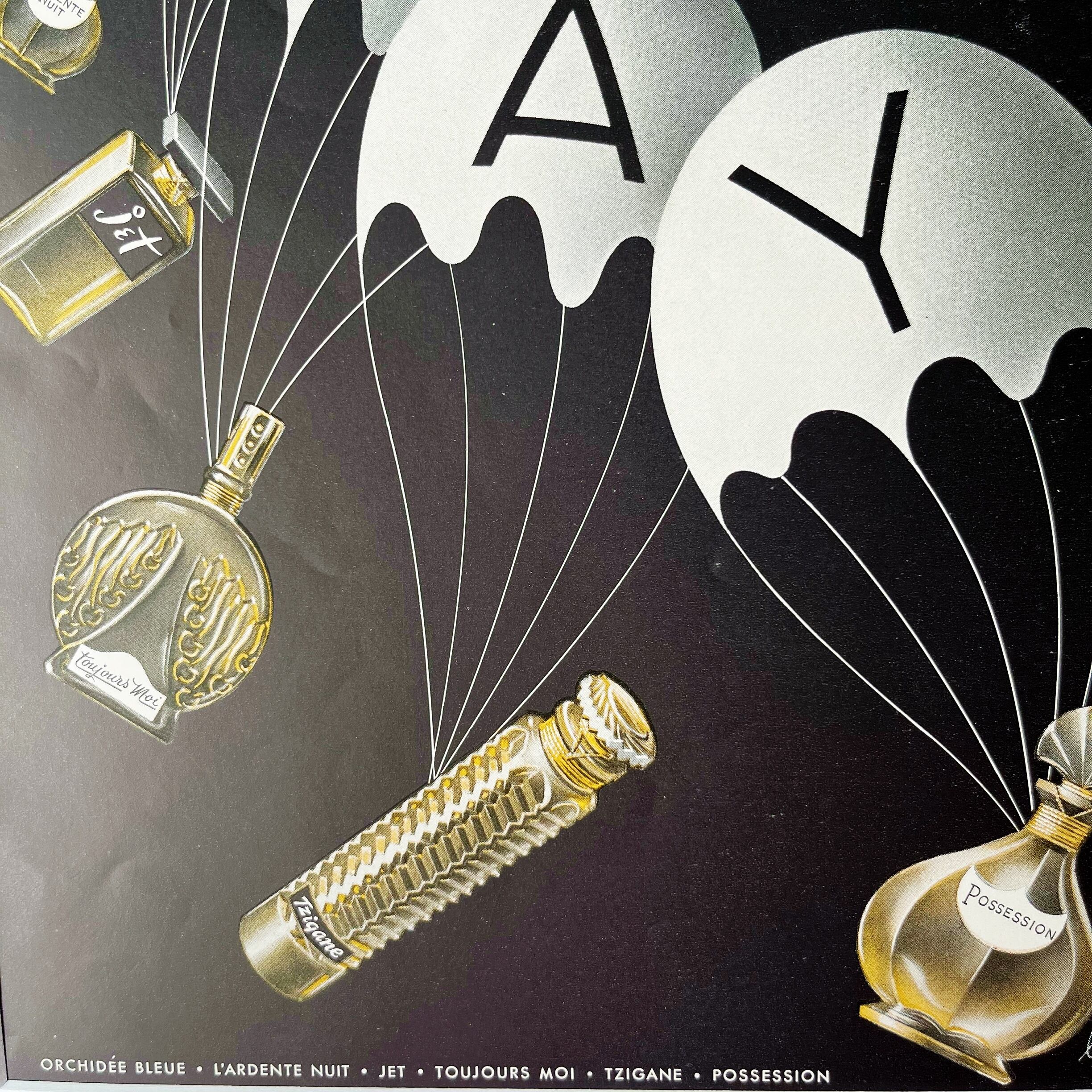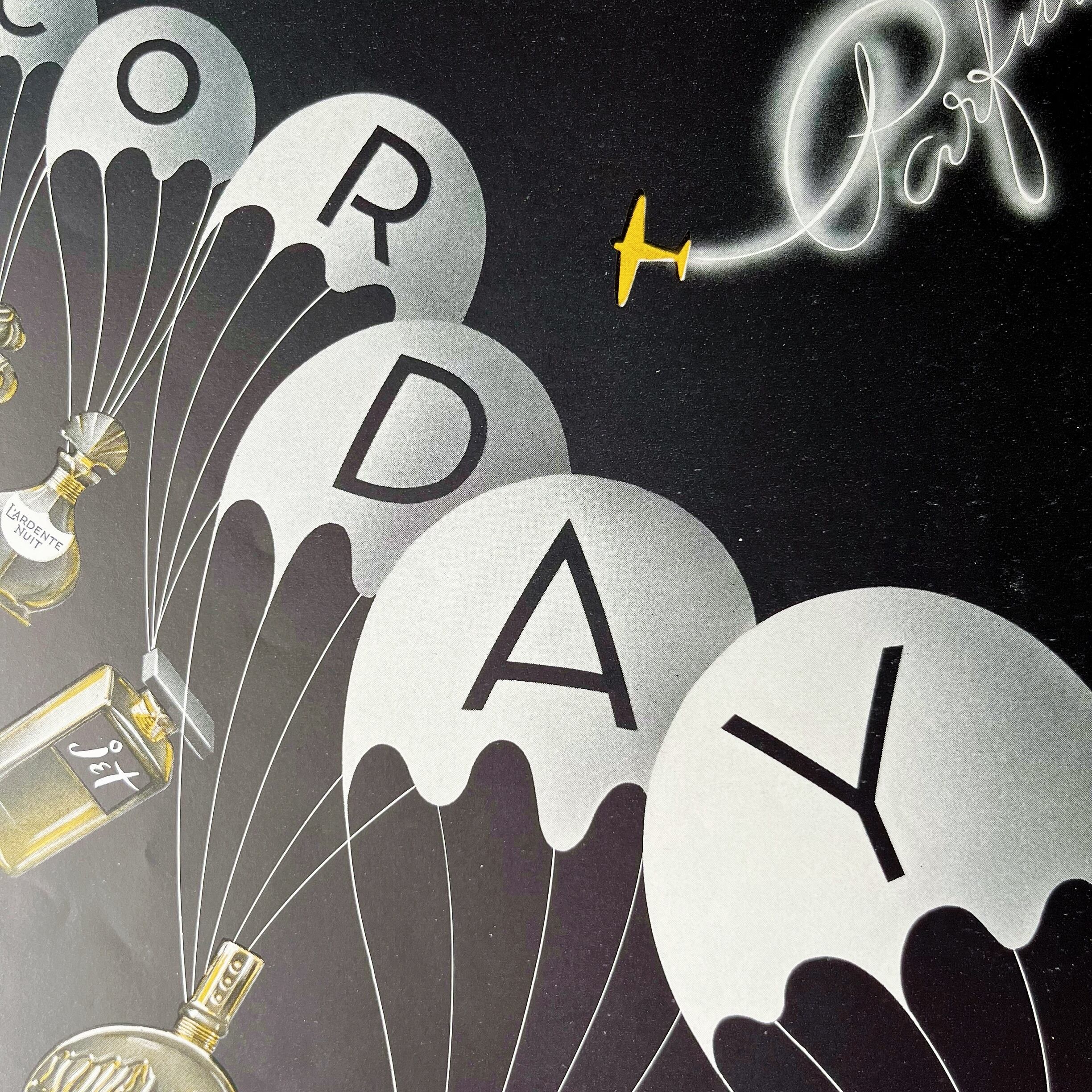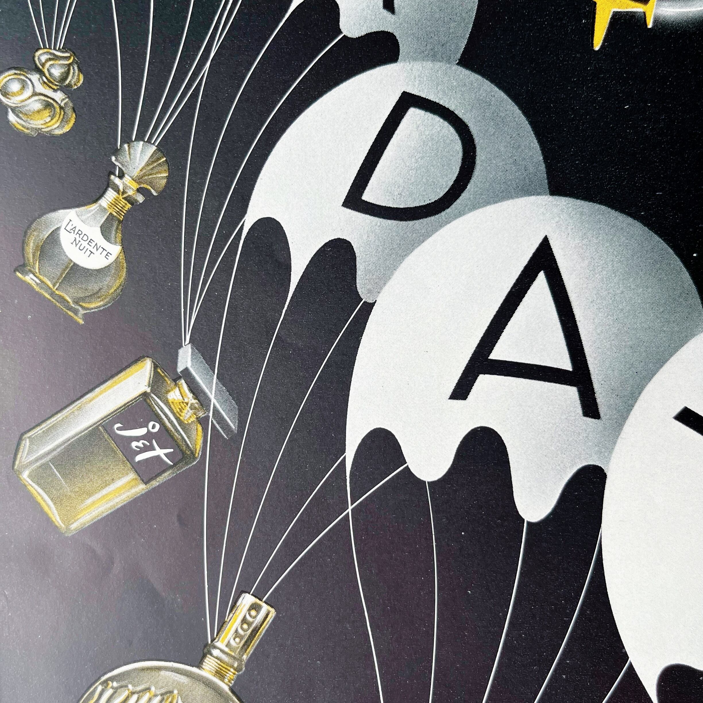クールな黒を背景に、パラシュートを付けた香水瓶が空から降りてくるユニークな絵柄。