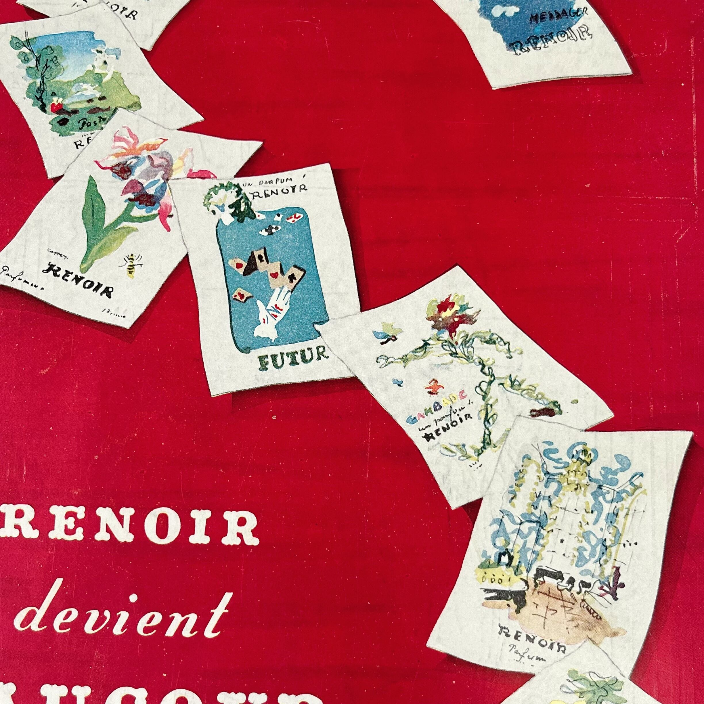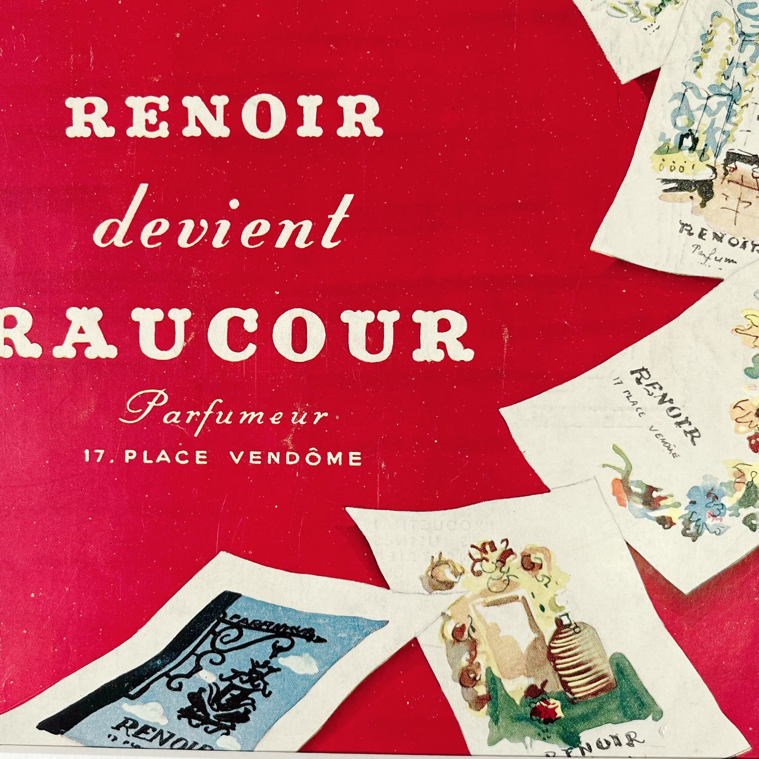 キュートな赤を背景に、過去の香水の広告が並ぶユニークなデザインは、レトロな温かみと遊び心が詰まっています。