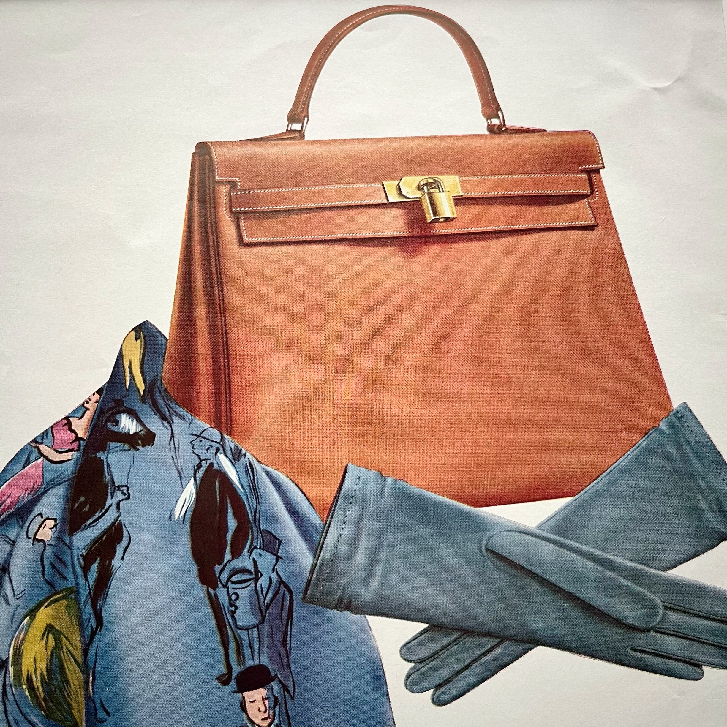 ブランドの象徴であるケリーバッグとカレ、グローブが贅沢に配された、レトロでエレガントなデザインが魅力的です。