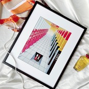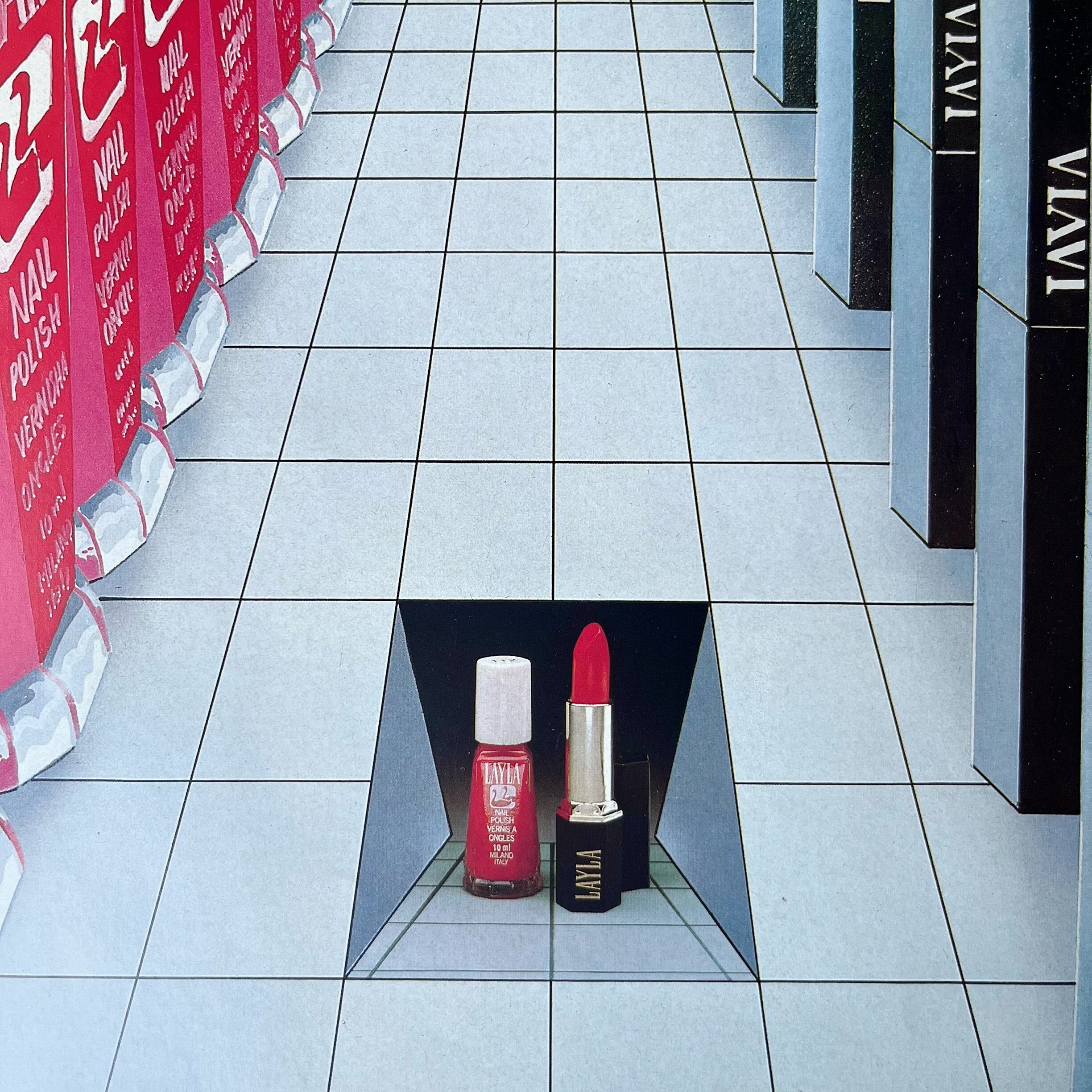 イタリアのブランドの口紅とネイルが美しく並ぶユニークなデザインは、まるで現代アートのような鮮やかなインパクトを放ちます。