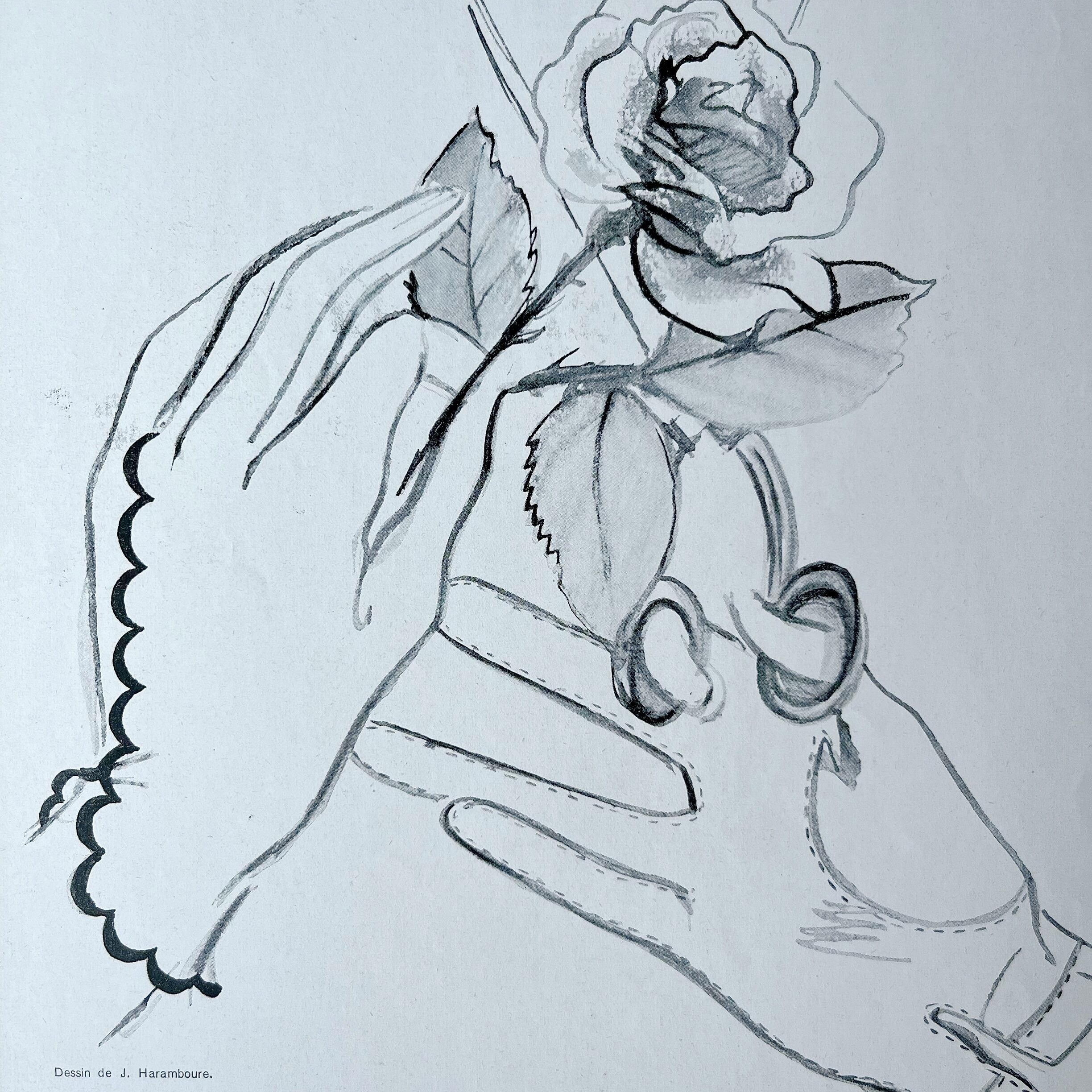 ブランドのグローブを身に付けた手がバラをカットするエレガントなデザインは、モノトーン調の中でも際立つ一品です。